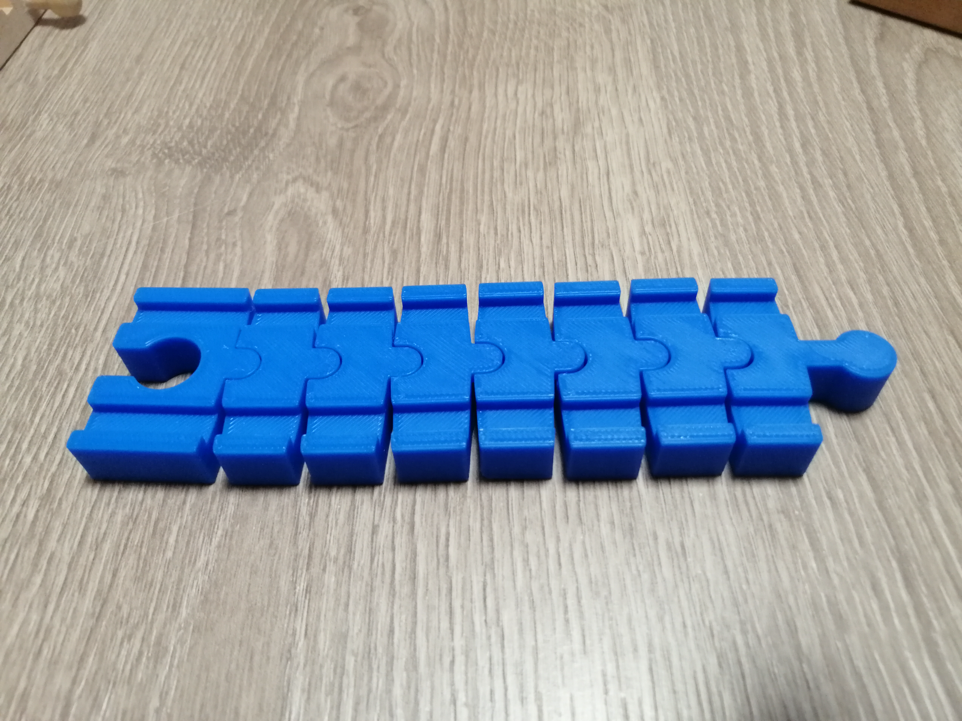 Eine verstärkte, flexible Schienenkonstruktion, speziell für Holzeisenbahnen. Die flexible Form ermöglicht es kleinen Kindern, sanfte Kurven und Verbindungen zu bauen, während verstärkte Gelenke die Haltbarkeit beim Spielen verbessern.