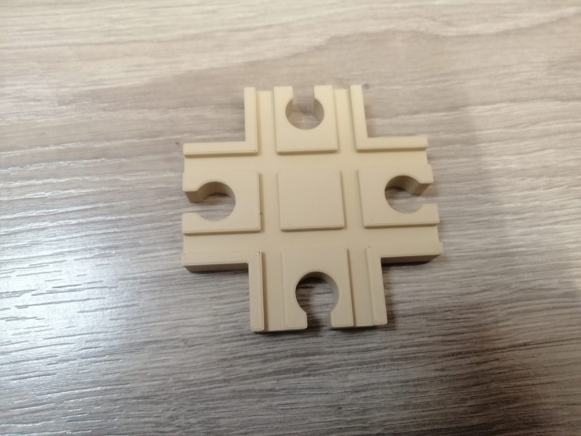 A four-way rail crossroads piece designed to add intersection routing to wooden toy train layouts. The cross-shaped design enables trains to change direction smoothly while remaining compatible with common wooden rail systems.