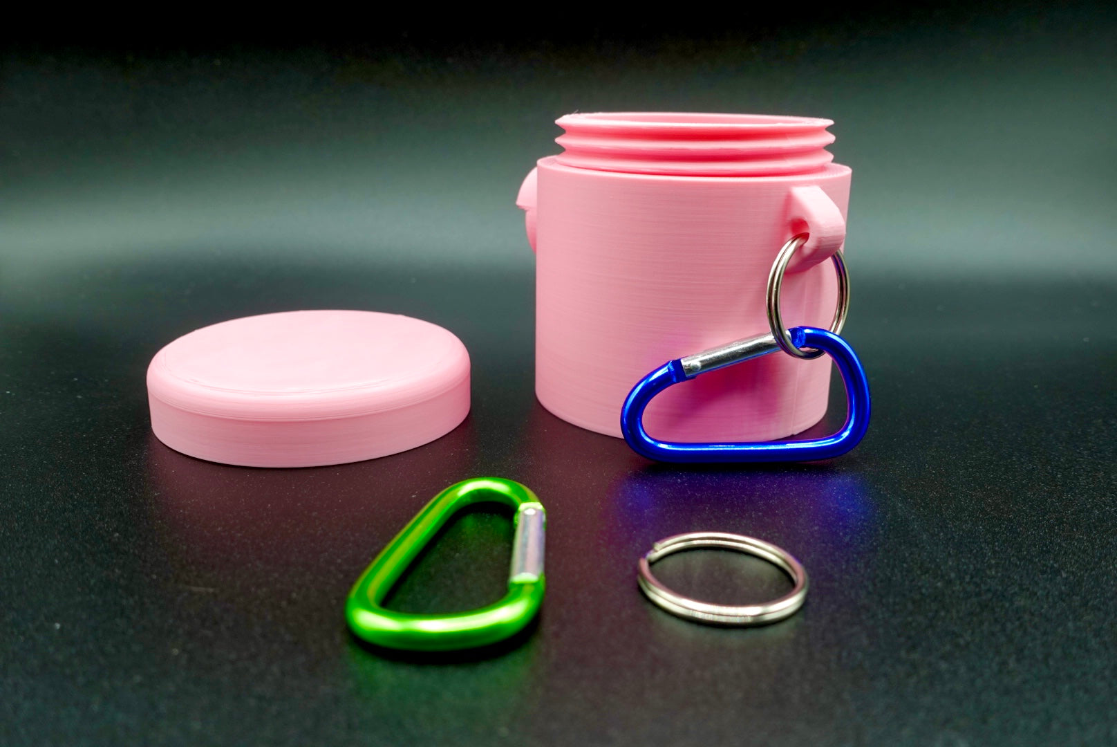 This travel stash container is designed to fit a keychain loop + carabiner clip so you're able to easily clip and un-clip from your bookbag.