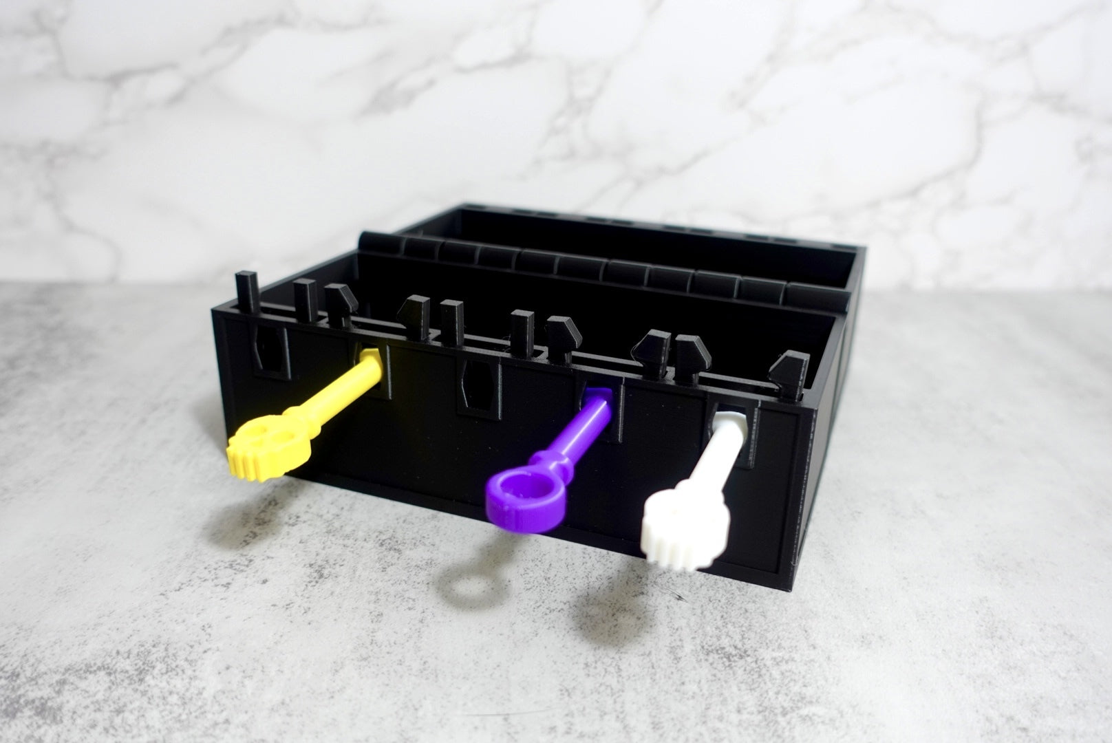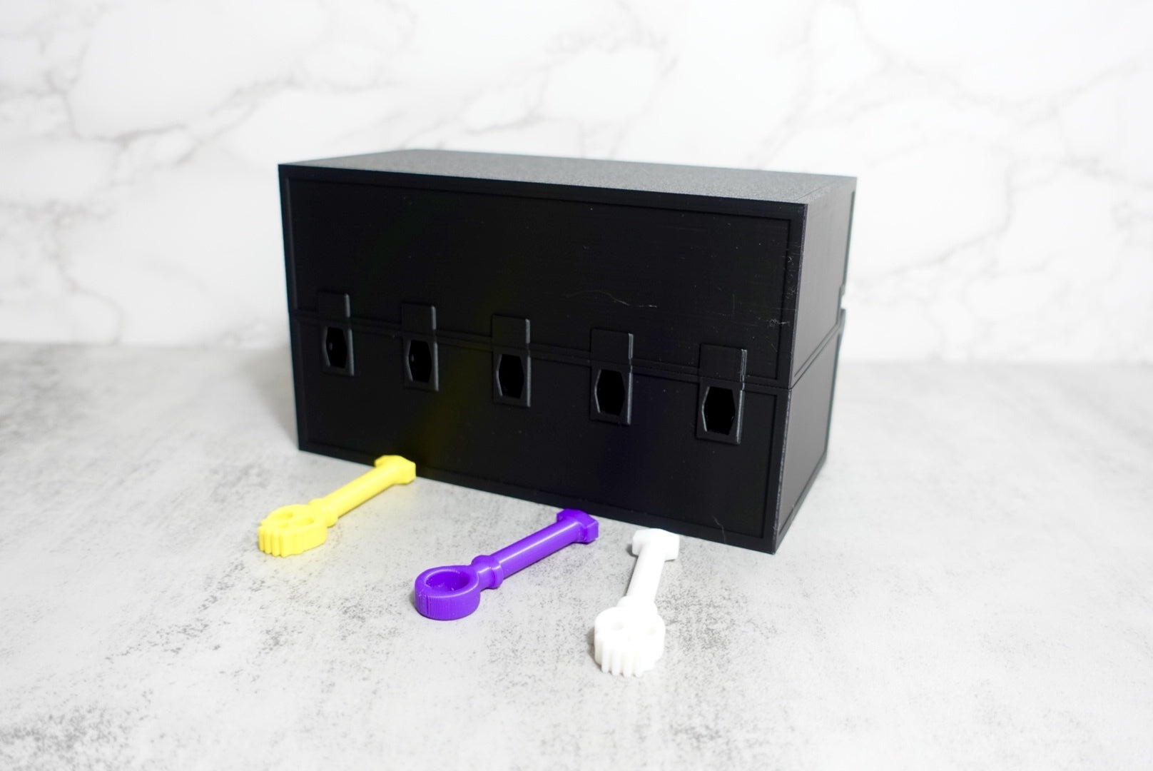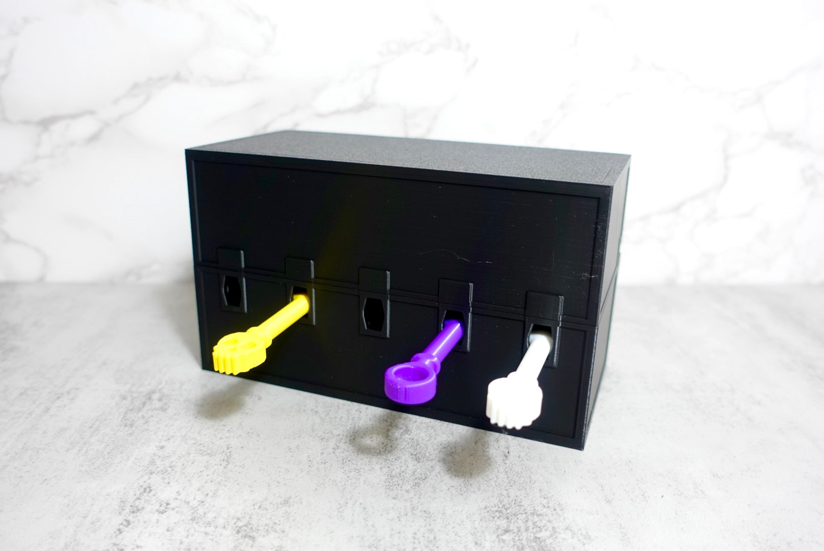 "This version of the print in place chest has five different locks... but two of them are fake! This chest will require three keys with the correct combination to unlock. Want to have even more fun? Give the person opening the chest only two keys, then after they start getting frustrated hand them the third key and say you forgot that this chest requires three keys to open, not two :)