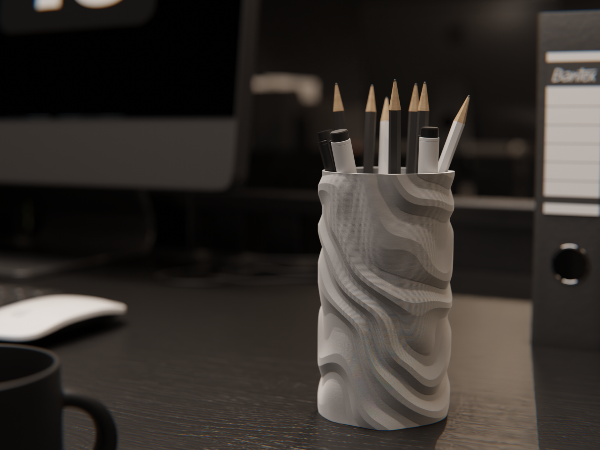 An organizer cup designed with a melting-style form that blends artistic character with everyday function. The fluid shape creates a striking visual effect while still serving as a practical holder for small desk items.
