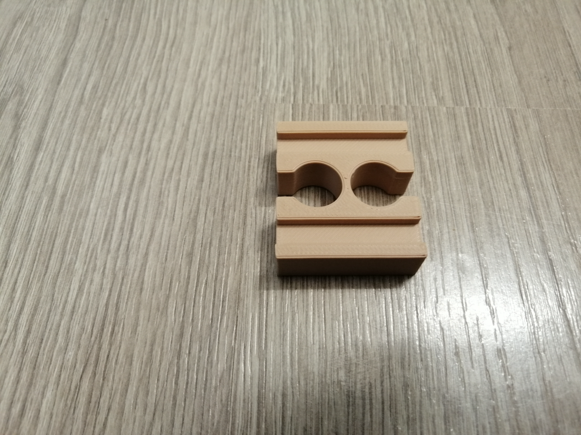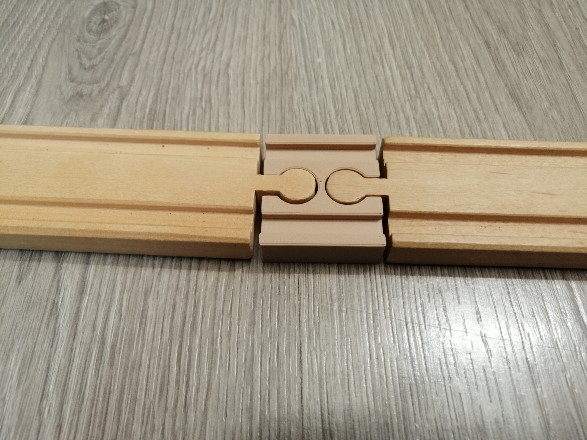 A simple female-to-female rail adapter designed to connect wooden toy train tracks with compatible systems. This adapter allows seamless connections between track pieces that share female connectors.